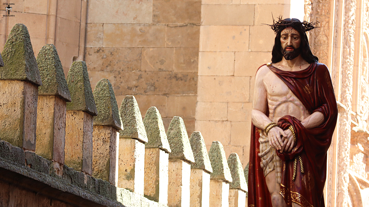 La imagen muestra al titular de la Hermandad, por la calle Libreros, recién franqueada la fachada plateresca del Estudio salmantino.