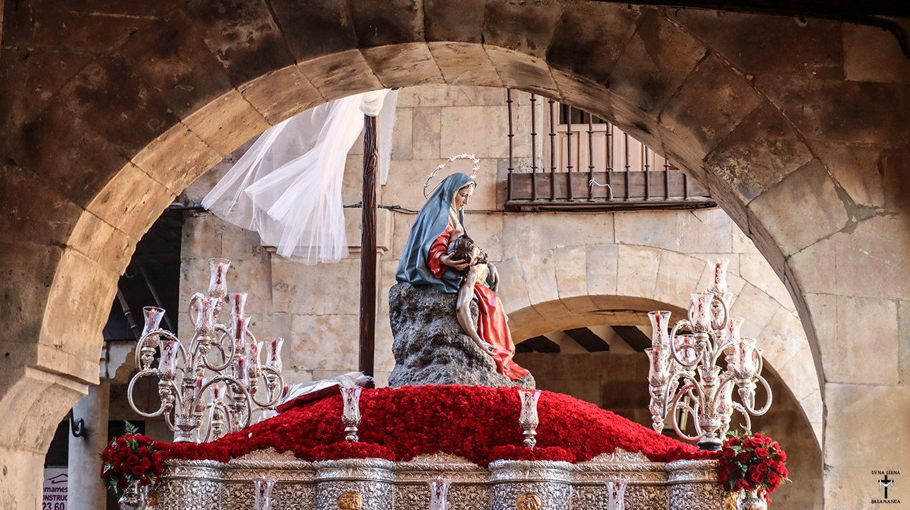 Ya de día, la imagen de Nuestra Señora de los Dolores, se dispone a entrar en la Plaza Mayor de Salamanca desde donde retornará a la iglesia de San Esteban y finalizar la "Madrugada Charra"