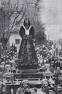 Van luego los asilados del Hospicio llevando con bandas negras las insignias de la pasión y las banderas plegadas y caídas.
