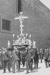 Sale a la calle un nazareno; los devotos que esperan en el pretil del Campo se agitan curiosamente, los chicos empiezan a gritar, se abren las puertas de la Cruz.
