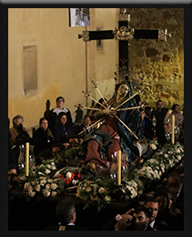 Es una procesión simple, sin grandes alardes. Los participantes no llevan hábito, simplemente trajes oscuros, sin música, solo con algunos cánticos religiosos y la parada del acto de Vía Matris frente a la portada de la iglesia del Convento de la Madre de Dios en la plaza de San Benito.