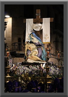 La imagen representa a la Virgen María, sentada al pie De la Cruz, con su Hijo muerto recién descendido. Es una talla anónima del siglo XVIII y se cree que pudiera proceder de las antiguas iglesias de San Justo o de San Polo. El grupo escultórico, una Piedad, contiene los elementos tradicionales de este tipo de obras: la cruz con el lienzo del Descendimiento, la Virgen María sedente y sobre su regazo, su Hijo muerto. Las imágenes están talladas en madera y posteriormente policromadas. Tanto las imágenes de la Madre y el Hijo, presentan un rostro sereno pese al dramatismo del momento. La cabeza de la Virgen está coronada con una diadema de plata. Las imágenes del grupo fueron sometidas a una restauración en 2023 que descubrió ante los ojos de los devotos unos colores mucho más vivos que los que recordaban tras muchos años de estar cegados por pinturas posteriores.