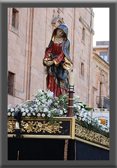 Con el impulso inicial del nacimiento en el año 1985 de la Hermandad del Silencio sacando a la calle una imagen ya existente, la Junta Directiva ve necesario encargar una imagen mariana que complete el desfile de la tarde del Sábado Santo. El elegido para dicha tarea es el artista Enrique Orejudo Alonso que talla la imagen de una virgen que regresa del entierro de su Hijo. La posición de la imagen, de pie, con las manos entrelazadas, la mirada perdida y levemente encorvada proporciona a quien se enfrenta a ella una sensación de tristeza. Viste la imagen una túnica de color rojo y un manto azul con una hermosa decoración dorada en los bordes.