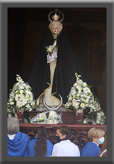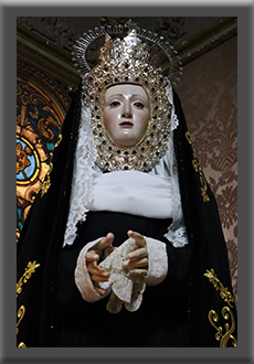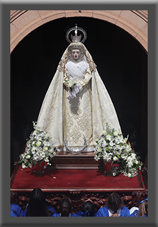 La Virgen de la Alegría es una talla anónima cuya fecha aproximada de realización se remonta al siglo XVIII. Es una imagen de vestir que solo asoma las manos y el rostro, completamente rodeado de un rostrillo de plata decorado con piedras preciosas. La cabeza está coronada con una corona de plata. Las manos sujetan un pequeño ramo de flores, si bien en un principio sostenían un libro. Viste saya y manto de color blanco que es cubierto con una fina capa de color negro la mañana del Domingo de Resurrección hasta el momento del Encuentro con Jesús Resucitado, en cuyo acto se desprende de dicha capa, quedando al descubierto su atavío habitual de color blanco, como símbolo de la advocación que encarna.